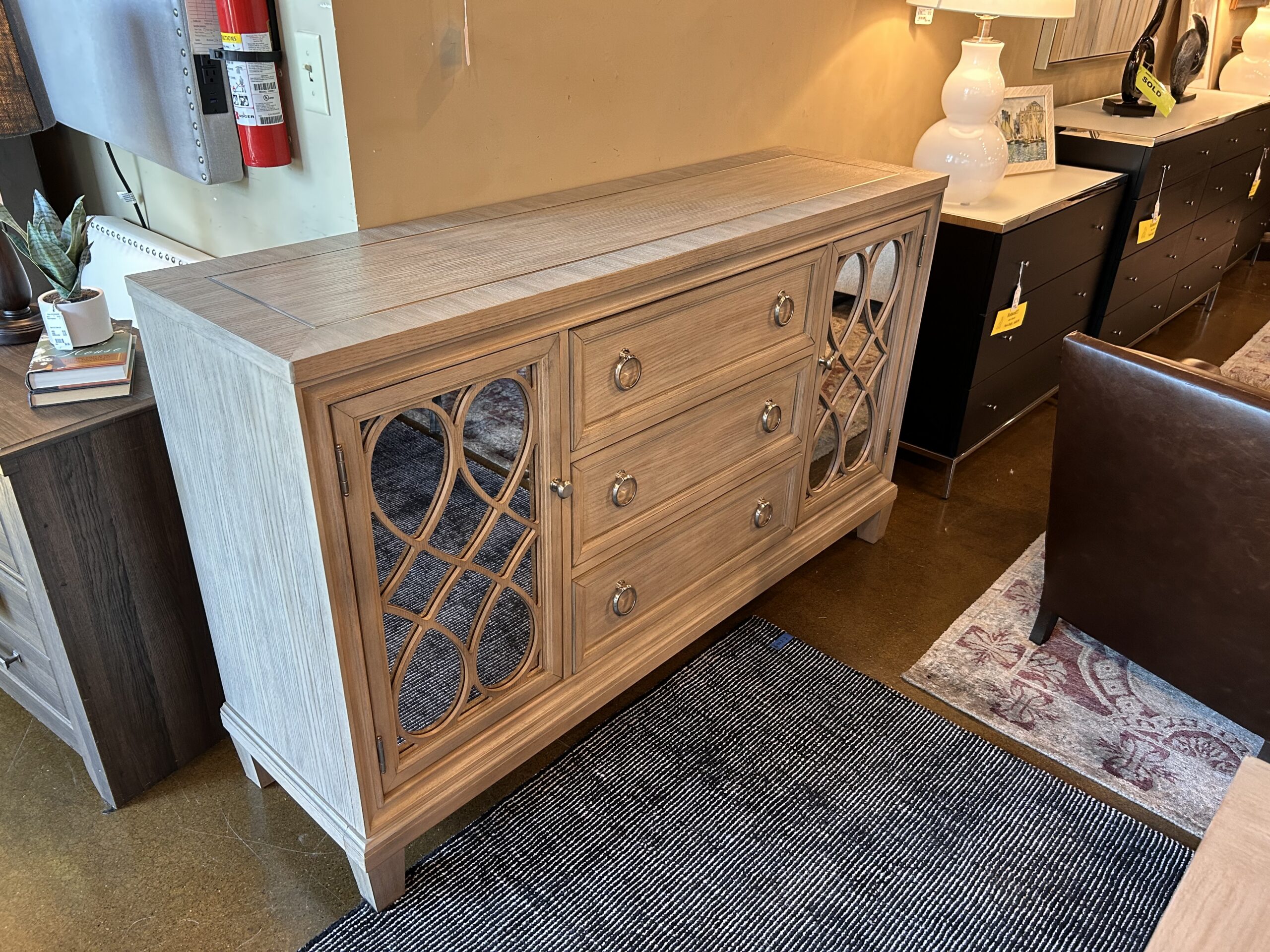 Gray Wood 3 Drwr, 2 Mirrored Cab. Side Board 6960-7
