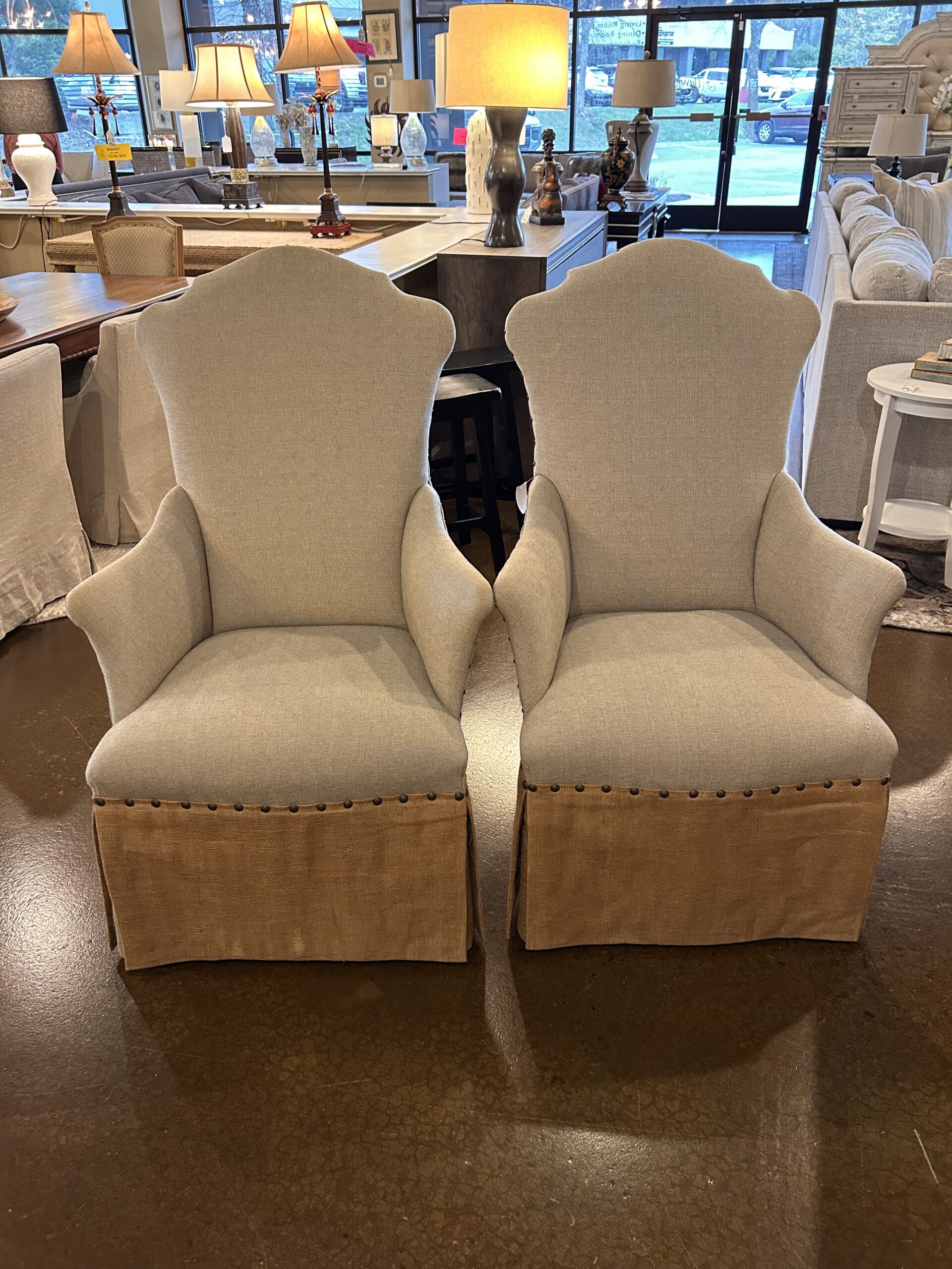 / PAIR Armed Beige & Burlap Fabric Chairs 6934-1